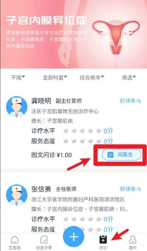 3、在疾病详情页面里,用户能够查看系统推荐的医生,并且可以直接点击“问医生”按钮,发起图文形式或者视频形式的问诊服务。