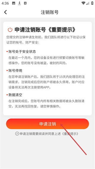 3、进入账号注销页面,勾选同意相关条款后点击【申请注销】按钮,系统会弹出确认弹窗。