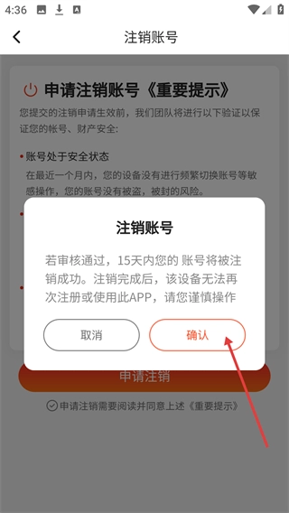 4、弹出注销账号的确认弹窗后,核对提示信息内容,点击弹窗内的【确认】按钮,提交账号注销申请并等待审核结果。