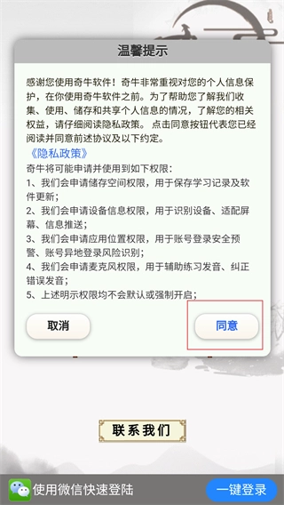 1、仔细阅读【温馨提示】中的权限说明内容后,点击【同意】按钮,以此确认接受相关协议,随后即可进入软件的功能选择界面。