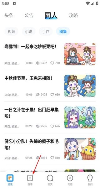 1、启动软件后,进入同人专区,浏览图集内容,点击底部的赛事选项切换到赛事页面。
