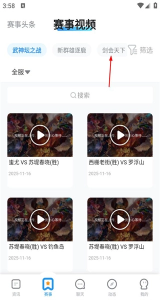 3、在赛事视频页面选择“剑会天下”分类,浏览该分类下的赛事视频列表,并查看每个视频的对阵信息。