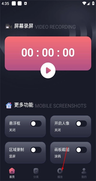 打开软件后,用户能看到屏幕录屏的相关功能,点击底部的播放选项就能进入对应的页面。