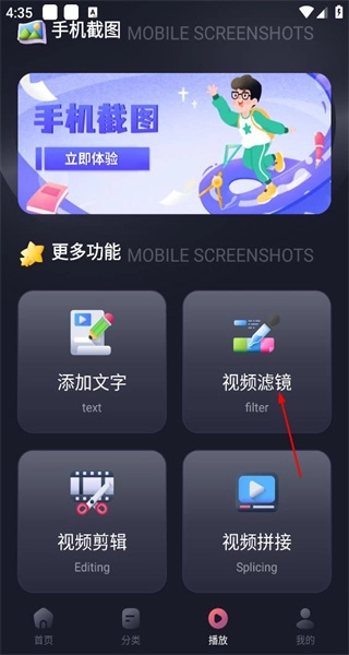 2、打开录屏截图软件的播放界面,查看更多功能选项,点击视频滤镜按钮,为处理视频内容做准备。