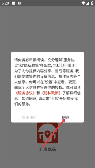 1、打开【汇廉优品】后会弹出提示窗口,需仔细阅读【服务协议】和【隐私政策】,点击【同意】按钮即可使用相关服务。