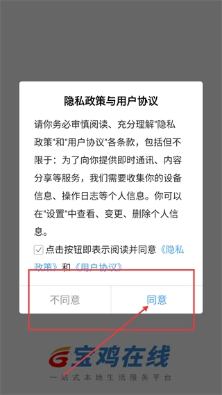 使用宝鸡在线前,请先阅读《隐私政策与用户协议》条款,勾选同意相关内容后点击【同意】按钮,即可进入应用的后续界面。