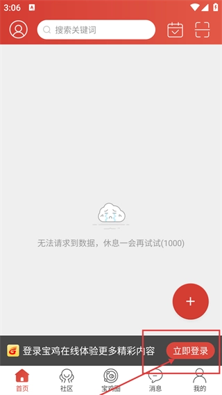 2、进入宝鸡在线首页后,要是碰到数据请求失败的提示,点击底部的【立即登录】按钮,就能开启账号登录流程,进而解锁更多功能。