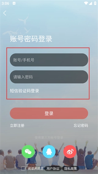 3、在【账号密码登录】界面,用户既可以填写【账号/手机号】和【请输入密码】进行登录,也能够选择【短信验证码登录】或者通过第三方账号完成登录操作。