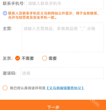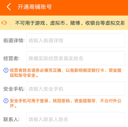 3. 随后依次填写商铺名称、所在地区、街道详细地址、经营者信息、安全手机号、联系人以及主营业务等内容,完成后点击“下一步”按钮提交申请材料。