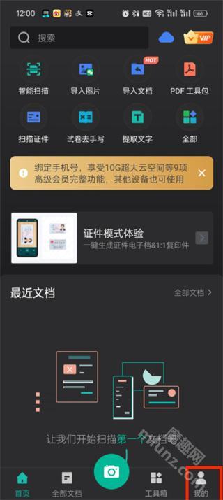 1、第一步是打开扫描全能王应用,进入首页后,能看到可以切换至全部文档、工具箱以及我的页面,此时我们点击右下角的【我的】选项;