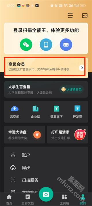 2、接着在我的页面里,能看到云空间、企业版、提取文字、开发票这些功能选项,此时点击【高级会员】即可。