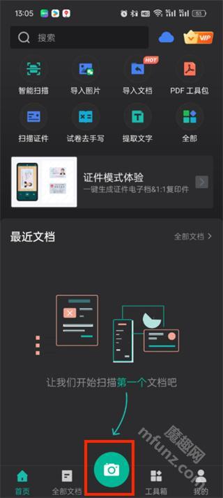 1、第一步是打开扫描全能王软件,进入首页后,要点击页面正下方的【相机图标】。