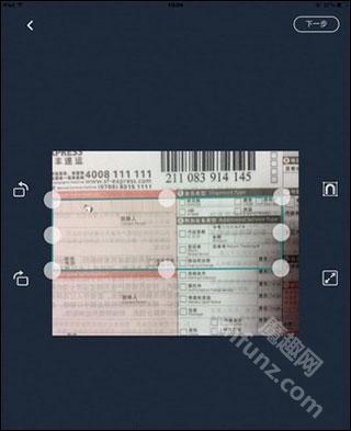 切边:选择完成拍摄,可以自动弹出切边页面,拉动8个蓝色的点来控制图像的边缘。此处可对图像进行旋转、吸附。选择右上方的“下一步”,会弹出一个美化页。