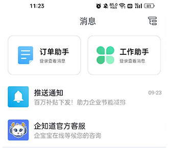 3.点击“消息”标签页,查看订单助手、工作助手相关内容以及个人交流信息。