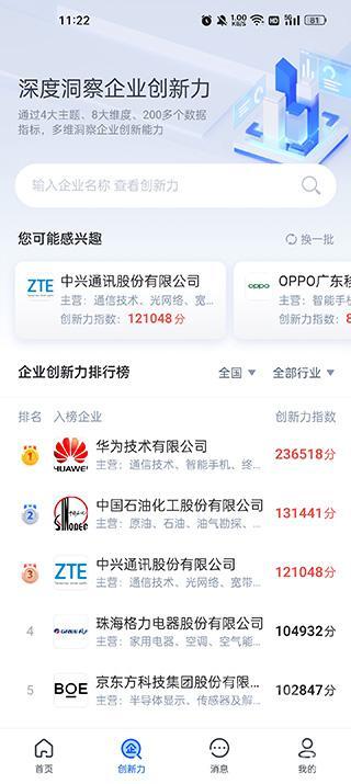 2. 点击“创新力”标签后,你可以查看国内各大企业的创新力指数以及相关信息。