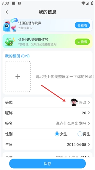3、点击头像旁的“修改”按钮,进入图片选择界面。