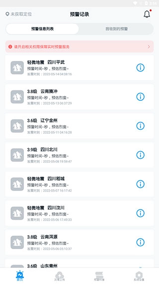 预警信息列表呈现的是大陆地震预警网发出的无通信延迟预警;实际接收到的警报可能会由于网络延迟、未在后台运行等情况而出现缺失。