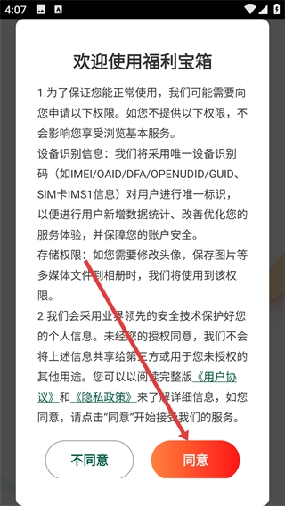1、进入【福利宝箱】界面时,要知晓其申请的【设备识别权限】与【存储权限】的用途,可查阅【用户协议】和【隐私政策】中的相关说明。