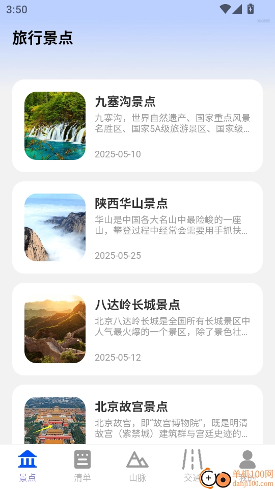 用户能够查看各个城市的旅游景点相关信息,了解景点的基础介绍以及可游览的时间。像九寨沟、陕西华山、八达岭长城、北京故宫和上海迪士尼这些大家熟知的景点都包含在内。