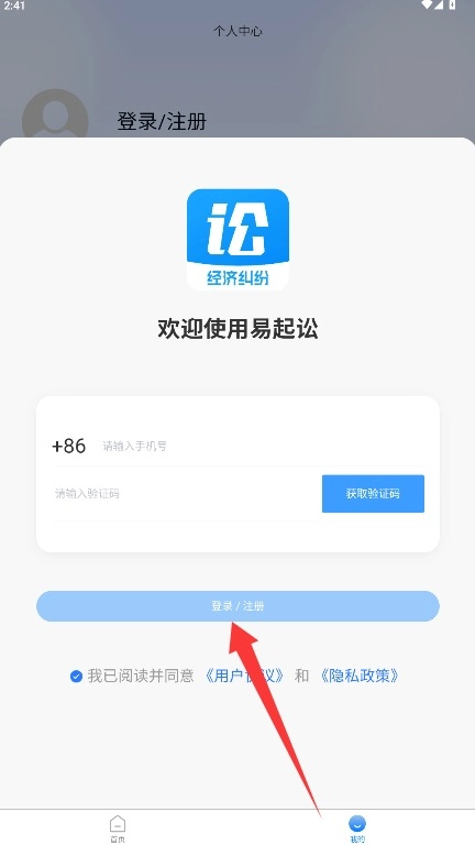 2、在登录页面填写手机号与短信验证码,勾选同意相关条款后,点击登录/注册按钮即可进入。