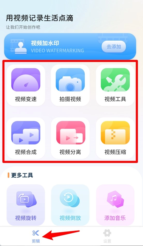 1、点击底部剪辑图标即可进入主页面,包含视频变速、拍摄视频、视频工具等多种编辑功能入口。