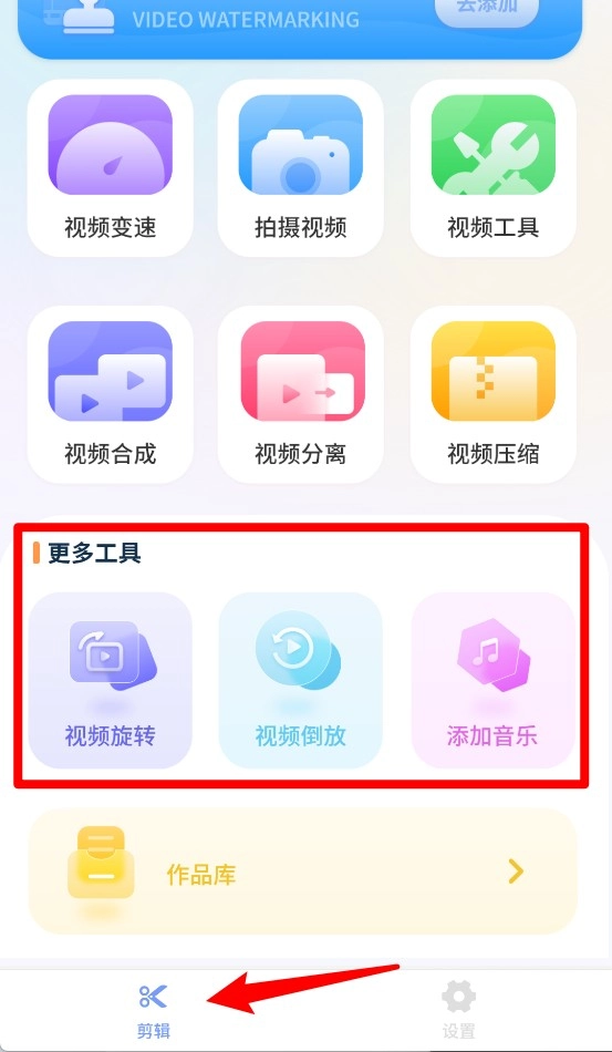 2、在主界面点击“更多工具”,就能展开视频旋转、倒放、添加音乐等额外的编辑功能模块,供用户挑选使用。