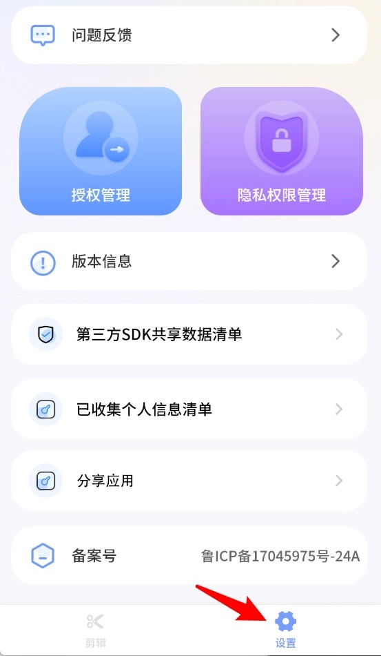 4、点击底部设置图标可进入设置页面,包含授权管理、隐私权限、版本信息及数据共享等选项。