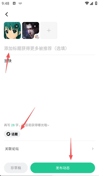 3、点击添加话题,输入你要发布的内容点击发布动态即可