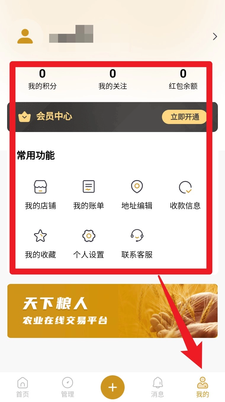 2. 登录账号后,点击界面右下角的“我的”选项,即可查看积分、关注列表、店铺信息、账单记录、收货地址等各类基础信息。