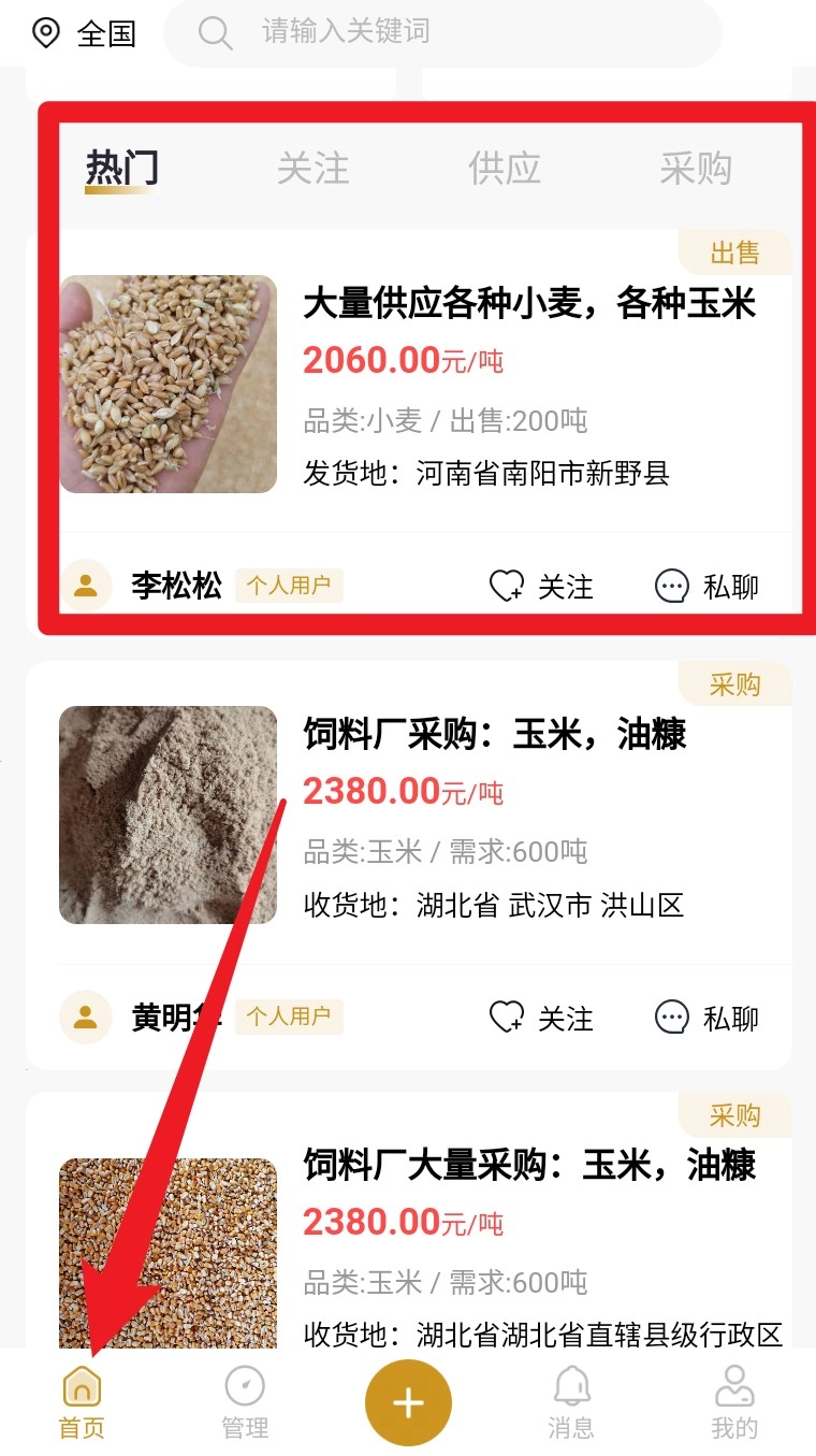 3. 切换至首页页面,即可查看供应与采购商品的相关内容,同时支持与卖家私聊以及对商品进行关注和收藏操作。
