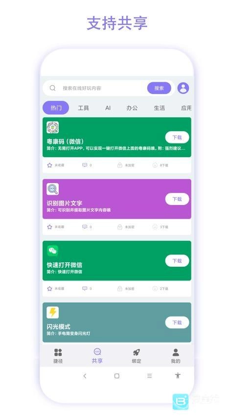 捷径助手是一款很好用的在线编程类软件,即使你没有任何编程基础,也能借助它完成一些简单的编程操作。软件针对不同功能提供了最基础的模板,你可以按照模板一步步修改内容,把这些操作保存为一键触发的功能,使用时只需简单触发就能完成,十分便捷。