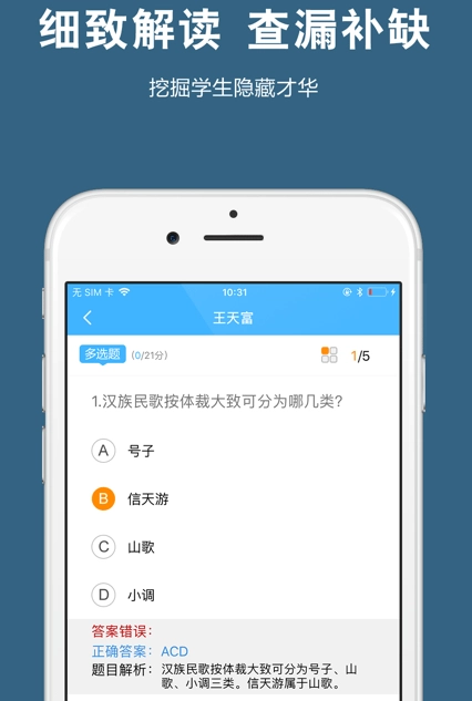 检查作业:系统第一时间展示学生做答情况,让您从繁琐的纸质试卷中解脱出来,高效使用课后时间,更好了解学生艺术学习情况,实现高质量教学