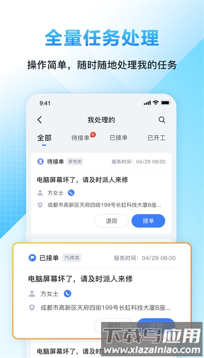 这款应用聚焦于维修订单的智能派单管理,用户能够实时掌握订单的进展和完成状态。系统会提供详尽的任务地点与任务量信息,拥有专项技能的用户可以在手机端查看订单分配的具体情况,进而实现线上自动化抢单,显著提高工作效率。