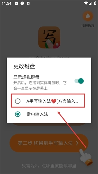 4、打开【更改键盘】的弹窗后,找到并选择【A手写输入法❤️(方言输入...)】这一选项,就能把它设置成当前正在使用的输入法了。