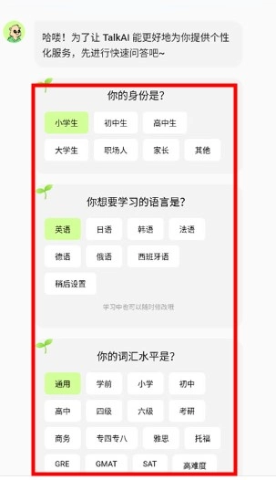 打开TalkAI口语练习功能后,根据系统指引填写个人身份信息并选择当前词汇掌握程度,这样平台就能为你匹配更贴合自身情况的学习内容。