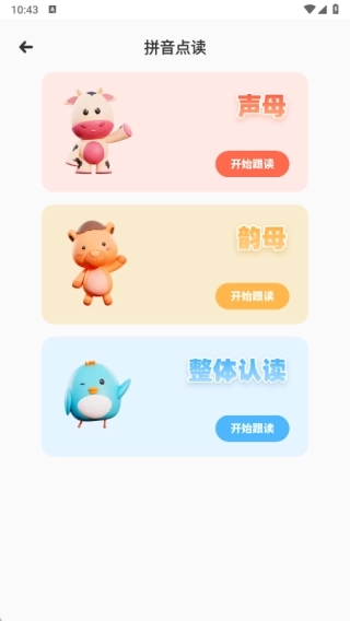 2、拼音点读页面包含声母、韵母、整体认读三个不同版块。