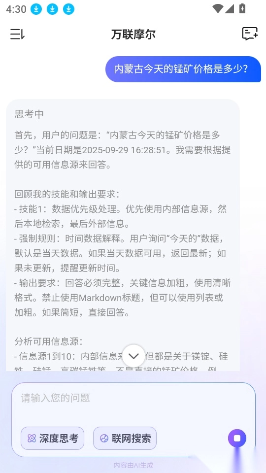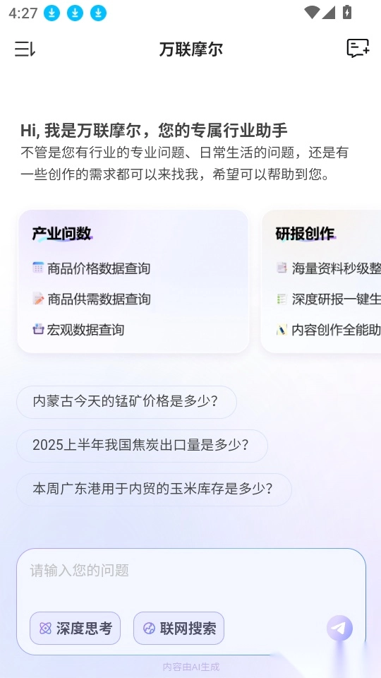 万联摩尔的核心功能是为用户打造产业领域的智能助手,助力用户便捷完成产业知识问答,快速生成实时行业报告;同时支持对相关企业展开深度分析,产出专业深度研报,并能让用户轻松掌握产业价格动态,实时预判现货价格趋势,清晰把握未来价格走向。