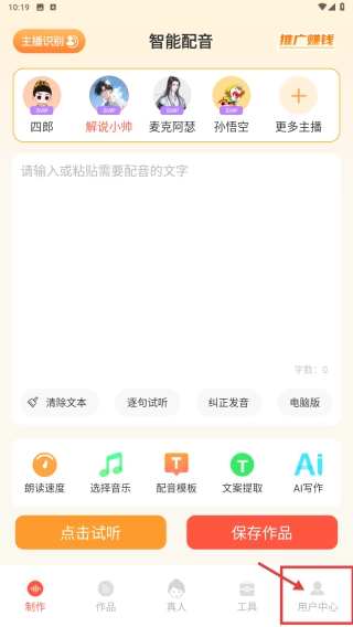 打开配音分类,点击底部的用户中心选项,进入个人中心页面。