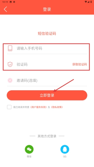 输入手机号码及验证码,勾选相关协议后点击立即登录按钮,即可完成账号登录操作。