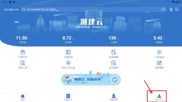 你可以这样修改:打开湘建云应用后,点击底部的用户中心选项,即可进入个人中心页面。