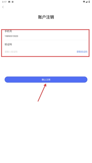 4、进入账户注销页面后,填写手机号并输入验证码,随后点击确认注销按钮,即可完成账户注销流程。