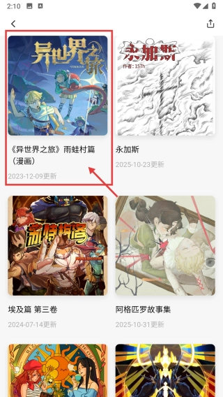 4、在动漫类创作列表中,点击异世界之旅漫画封面,进入作品详情页。
