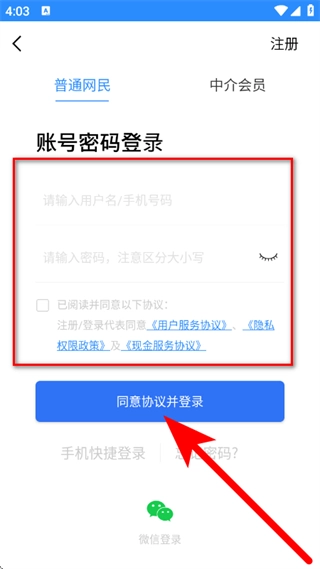 请输入用户名、手机号码和密码,勾选相关选项后,点击“同意协议并登录”按钮完成登录操作。