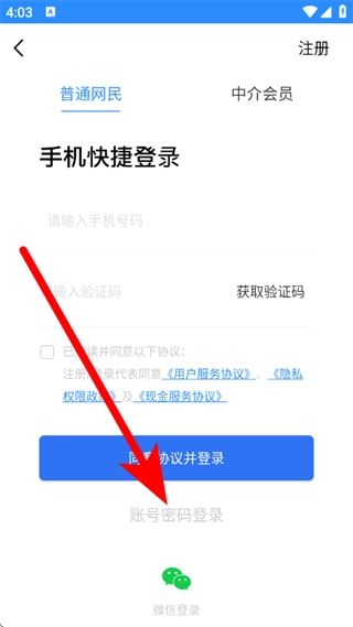 在注册页面,点击“账号密码登录”选项,即可进入密码登录页面。