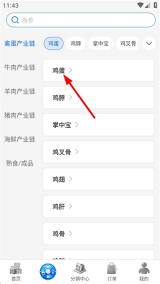 进入分类页面后,点击禽蛋产业链下的鸡蛋选项,即可查看鸡蛋相关的商品列表。