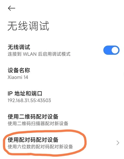 部分系统在该位置设有“无线调试”的开关选项,需先将其打开,之后点击左侧的圆形区域,即可进入无线调试的操作界面。