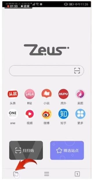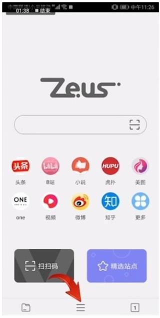 1、启动宙斯浏览器并开始运行,点击主页面的搜索栏即可输入关键词或网址进行搜索,下方的快捷键能够便捷地打开一些应用。