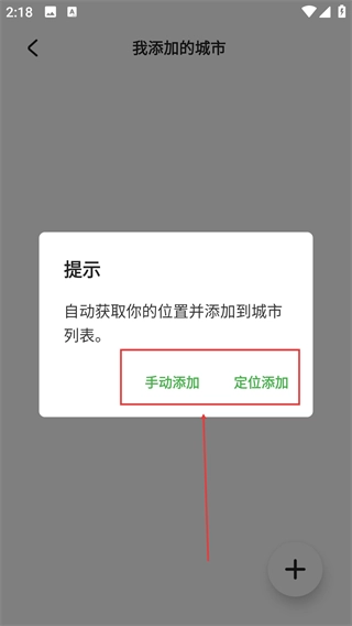 2、进入【我添加的城市】页面,点击加号弹出提示后,选择【手动添加】,输入城市名称即可添加对应天气信息。