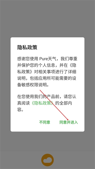 1、在【Pure天气】的隐私政策弹窗里,阅读完内容后点击【同意并进入】按钮,就能进入应用使用天气查询相关功能了。