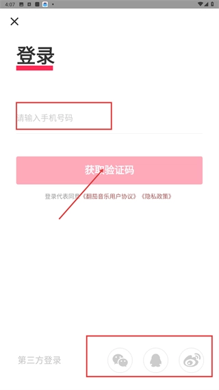 3、在登录页面中,您既可以在【请输入手机号码】输入框填写信息后点击【获取验证码】,也可以选择页面下方的第三方登录选项来完成登录操作。